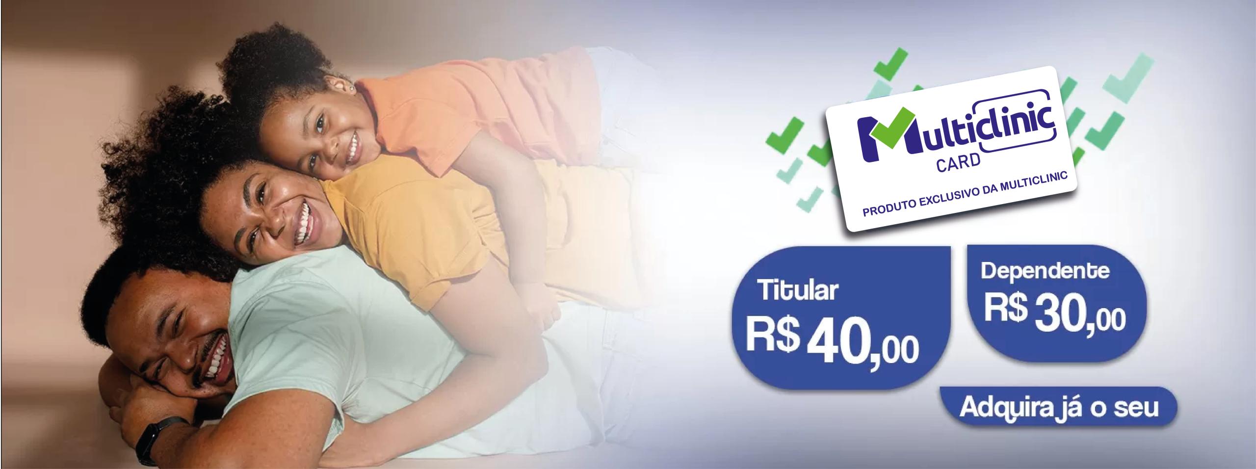 Com o cartão MulticlinCard, um produto exclusivo da Multiclin, além de uma série de benefícios, você pode ter descontos de até 50% em todos os atendimentos realizados na nossa clínica e até 50% em serviços dos nossos parceiros (CONSULTE CONDIÇÕES).
